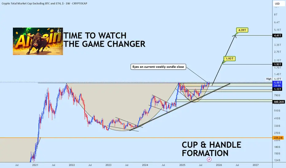 The TOTAL3 chart (Total Crypto Market Cap Excluding BTC & ETH) is on the verge of confirming one of the most reliable and powerful bullish patterns in technical analysis: a massive Weekly Cup & Handle formation.