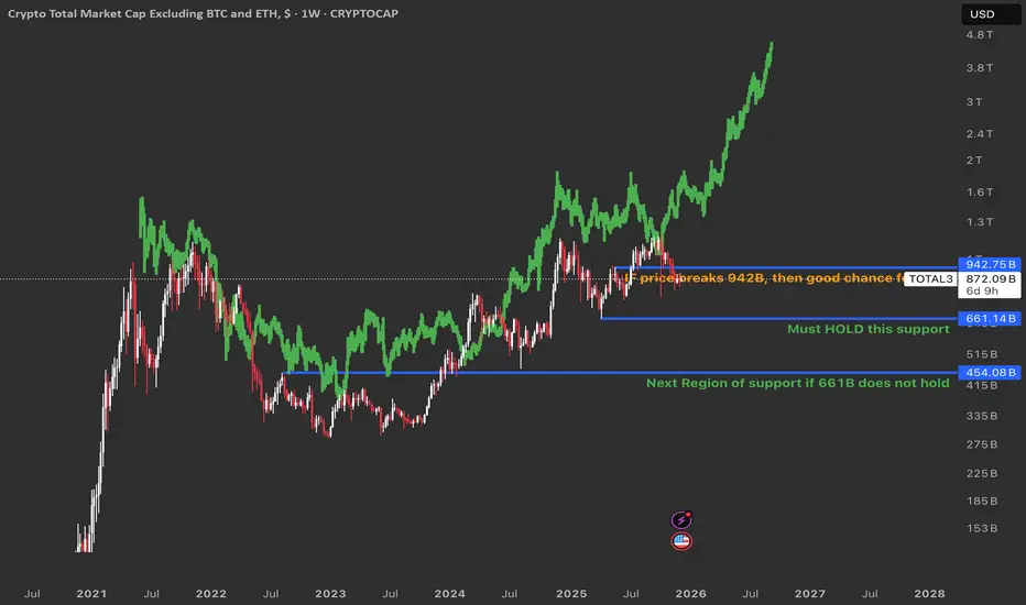 If TOTAL3 breaks and holds above 942B, it means buyers are strong and the market is likely ready for a big altcoin bull run.