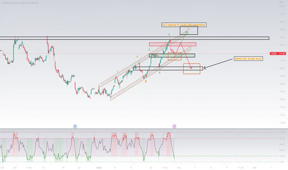 We may go lower tomorrow then a hard bounce to fill the gap, now this resistance has been hit 4 times.. If we hit it again theres a good chance we could break it and that would take us up to around $24.5 range, resistances get weaker the more times they are hit so watch for breaks and volume. If we Fill the gap with a hard rejection i believe we are headed down to the $20.20 range. This would be a correction after the wave 5 to 50 to 60% fib level..