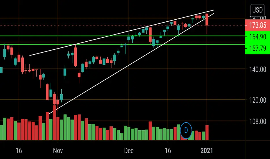 Rising wedge pattern on daily chart. Support lines are green.. if 164 doesn't hold , Tqqq will do a double top into 157.. Maybe fears of new covid strain will bump fang and prevent this