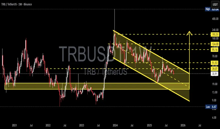 TRB (Tellor) is now entering a crucial phase. After the massive rally in 2024, the market has pushed TRB into a structured correction forming a clear descending channel on the weekly timeframe. This chart reflects the ongoing battle between long-term accumulation and medium-term selling pressure.