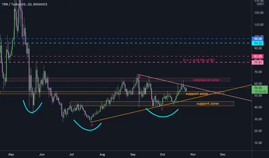 TRB is trading below a descending resistance line. price rejected from this line but hold above support zone.