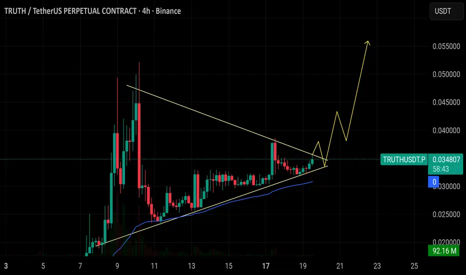 $TRUTH is pressing right at the breakout point of a symmetrical triangle, riding strong ascending support as the range tightens. If this zone holds, the triangle breakout path activates momentum can accelerate quickly above the trendline, targeting the 0.055 zone.
