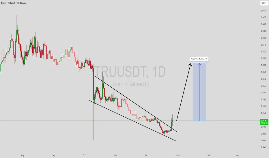 TRUUSDT is forming a clear falling wedge pattern, a classic bullish reversal signal that often indicates an upcoming breakout. The price has been consolidating within a narrowing range, suggesting that selling pressure is weakening while buyers are beginning to regain control. With consistent volume confirming accumulation at lower levels, the setup hints at a potential bullish breakout soon. The projected move could lead to an impressive gain of around 90% to 100% once the price breaks above the wedge resistance.