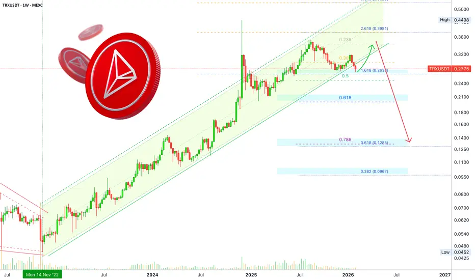 TRON will not be spared from the 2026 bear market. We have mainly two points to consider on this chart: