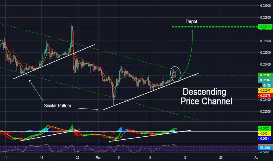 Here today I have noticed on the 4 hour chart the formation of a descending price channel. We entered this channel Jan 27th and have breached this channel a few times, only to fall back into the channel failing to make a change of trend. Looking at the chart pattern of breaches we can see that TRX is due to breach this channel once again and reach towards a target that is equal to the depth of the channel itself. If TRX is able to stay out of this channel for a few days then we will see a new trend.