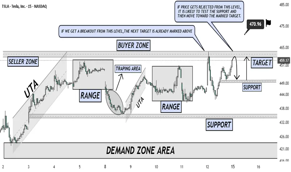 TSLA is currently trading inside a well-defined range after a strong upside move from the demand zone, showing clear market structure with buyer and seller zones in play. Price has already reacted from the upper resistance area, where rejection is possible, indicating that sellers are defending this level aggressively.