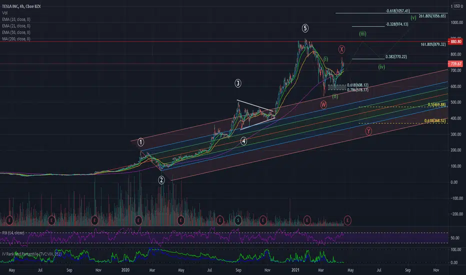 1) If this is the bear case then we have just completed the X leg, peaking at 780, which is just past the 0.618 retracement of the W leg. We could continue to head down from here, to complete the Y leg at the 0.5-0.618 retracement of the previous 2019-2021 move. This puts us at anywhere from 370-470. This scenario however is unlikely in my opinion because we have now broken above the 200 MA and the 21 EMA (green) has crossed the 50 EMA (yellow), with the price currently holding above the 10 EMA (blue). This gives us several support levels that the price would have to break through in order to move further down.