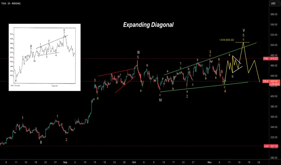 Tesla (TSLA) appears to be forming an Expanding Ending Diagonal pattern on the 1-hour chart, suggesting the final stages of a larger impulsive structure. Wave (V) seems to be unfolding with internal subdivisions visible, possibly targeting the 1.618 Fibonacci extension near 505 before a sharp reversal.