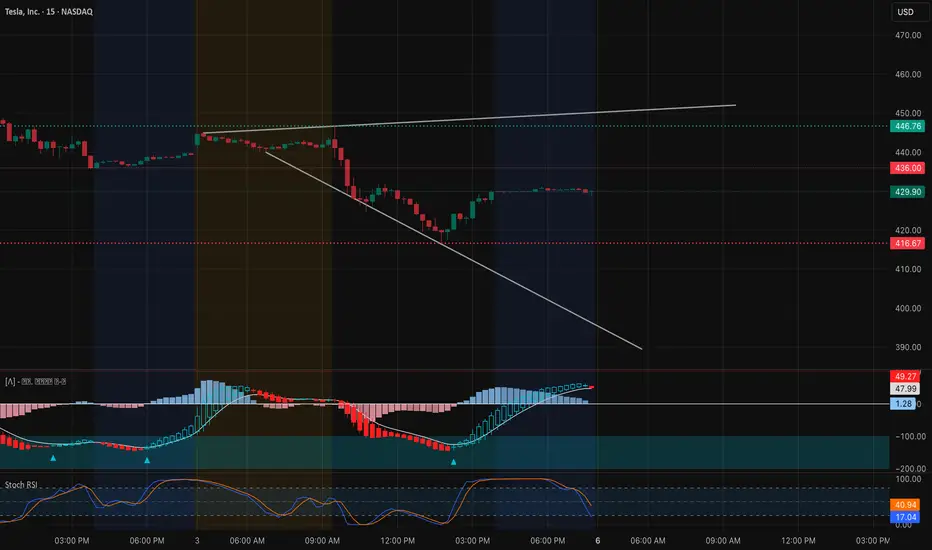 The MACD histogram has turned positive, and the blue line has crossed over the red, suggesting early bullish momentum building up after a short-term exhaustion. The Stoch RSI has curled upward from oversold territory, hinting that the stock may be setting up for a relief bounce if the intraday trendline breaks cleanly above $432–$435.