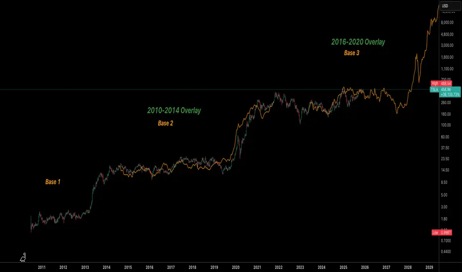 This is a TSLA weekly log-scale structure study that overlays prior “bases” onto the current price action to highlight Tesla’s repeating rhythm over the last decade-plus. Base 1 is normalized and overlaid onto Base 2, and Base 2 is then overlaid onto the current Base 3 to compare how Tesla historically moves from long, flat ranges into powerful expansion legs.