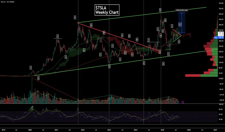 TSLA has been trending within a long-term bullish channel. From 2019 to Jan 2023, price completed a 5-wave Elliott impulse sequence, with each impulse wave showing bearish volume divergence — confirming volume peaks and overbought RSI conditions into the Oct ’21 top.