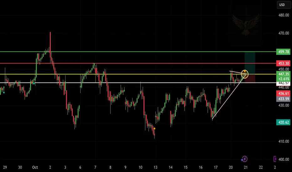 A breakout above this level could trigger upside momentum toward $453 and $459 (next resistance levels).
