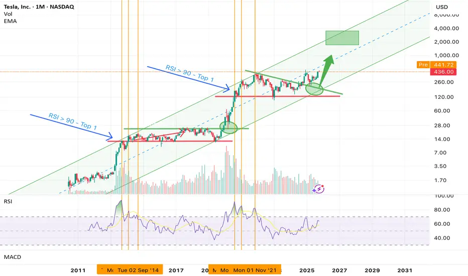 Today, with the stock trading above $430 and advancing toward the channel median — already within proximity of the next resistance zone around $480–$500 — the most powerful signal comes from momentum rather than price. The monthly RSI tells us something crucial: we are not near a cycle top. In fact, historical patterns suggest Tesla is entering the expansion phase of a new multi-year bull cycle, with much higher prices still ahead.