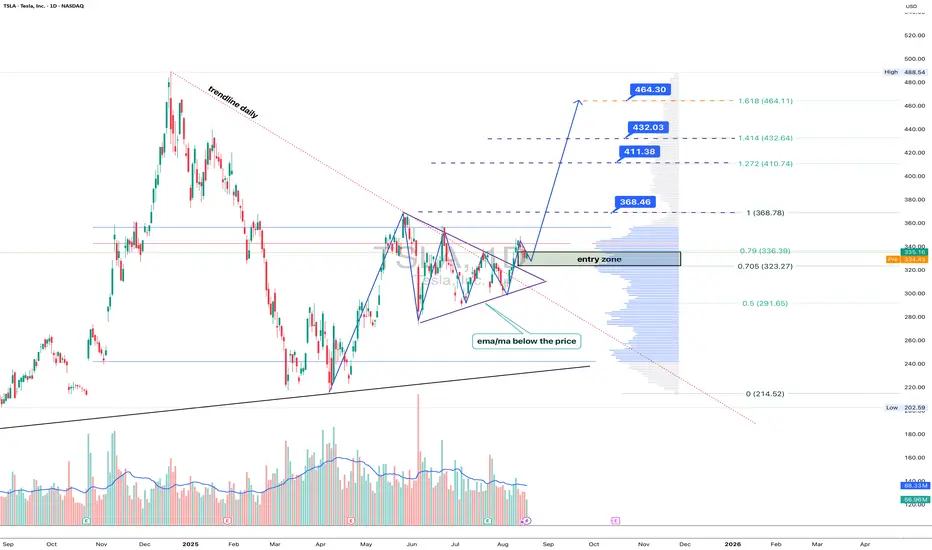 Technically, Tesla broke out of a symmetrical triangle while holding above EMA/MA supports, which confirms bullish control. The breakout unlocks targets at 368.46 (Fibo 1), followed by 411.38, 432.03, and the 1.618 extension at 464.30. Volume profile confirms strong accumulation below, leaving the upside path less crowded.