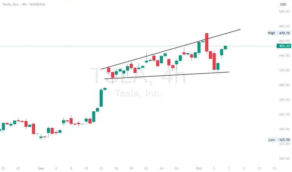 TSLA - Stock moving higher pre product launch tomorrow. Seeing multiple call buyer coming in as well. Stock is in a triangle pattern on the 4 hour time frame bouncing off bottom of the channel. Stock has top of the channel is at $470. bigger move about that level. Stock is decent at the indicator level.