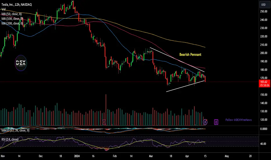 TSLA) stock is down 3.22% with a Relative Strength Index (RSI) of 39.72 indicating an oversold position for the stock. The Monthly price chart indicates a Bearish Pennant for the stock.