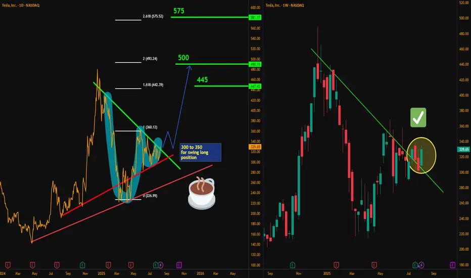 Hello traders, here’s my latest analysis on Tesla (TSLA) based on the weekly and daily timeframes. On the weekly chart, I have drawn a downtrend line starting from December 2024, and the recent price action shows a breakout above this line on a weekly close. This breakout is a promising sign that an uptrend may be developing in the medium term.