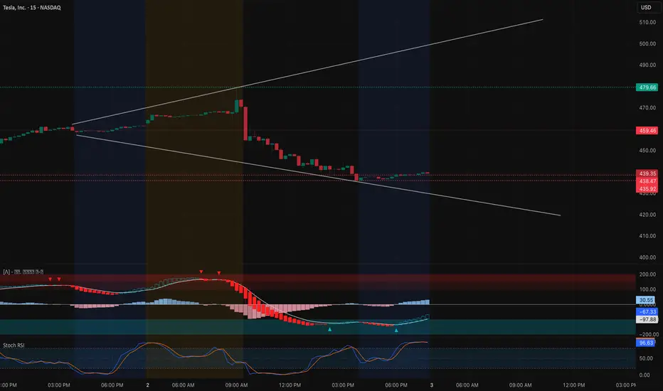 Tesla (TSLA) saw a sharp selloff, sliding from the mid-$470s to close near $439.35. On the 15-minute chart, the structure is now hugging a descending support line: