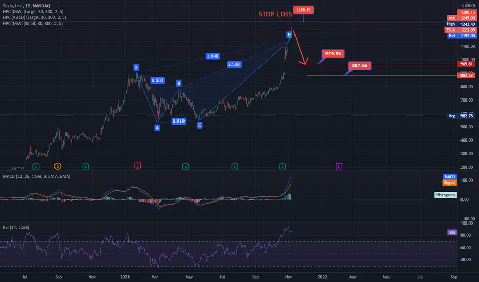 TSLA ON Daily Chart PUT may work PT1 $974. STOP LOSS if close above $1288.