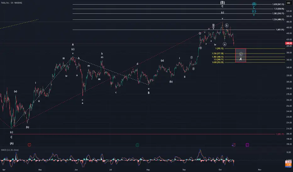 Another thing I want to point out is that in the overnights, Robinhood is showing Tesla trading @ $423 currently, and has raised as high as $425. This could be pointing to a couple things. The first is that the minute ((c)) wave is just subdividing into a smaller 3-wave pattern that will ultimately end within the target box to conclude minor A wave. The other is that Friday's low was the minute ((a)) wave low with ((b)) currently underway. Then lastly, it could be pointing to my ALT turquoise count that suggests another high to the low $500's is needed.