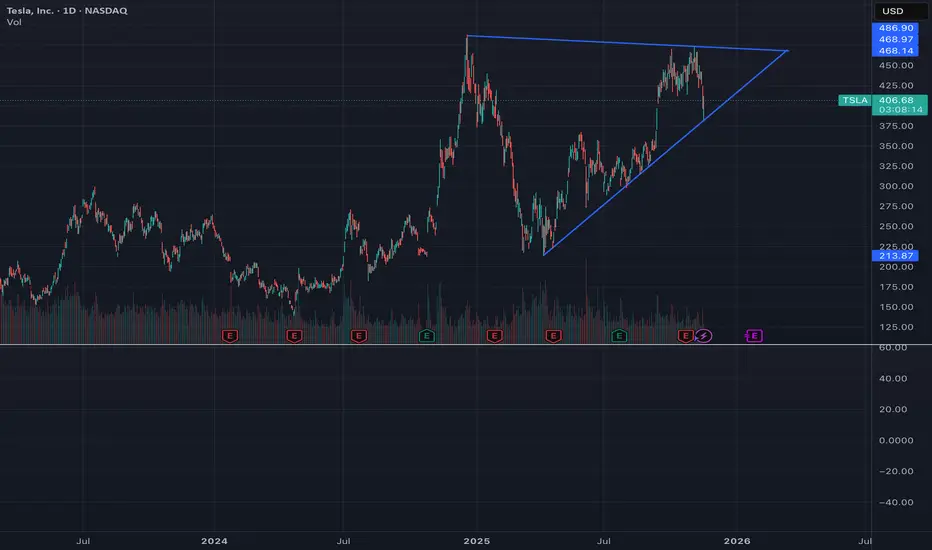 Tesla has just tapped its long-term ascending support line, respecting the multi-month higher-lows structure that has guided price since early 2024. The rejection from the trendline coincides with rising volume and early signs of momentum recovery, suggesting buyers are defending this zone. As long as TSLA holds above this support, the setup favors a move back toward the upper resistance of the symmetrical triangle, with downside risk limited to a break below the trendline.