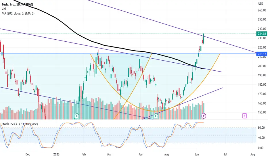 DCAing into a Tesla short here. Dont care what asset it is I will always start nibbling at a maxed out 1 day RSI. Short 20% of my max position for this trade, will add as it goes higher, dont care. This will mean revert. I will then long the cup and handle neck for bounce.