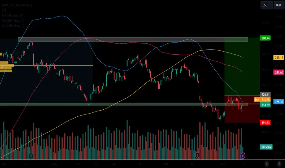 TSLA is trading in the middle of its 52-week range and below its 200-day simple moving average.