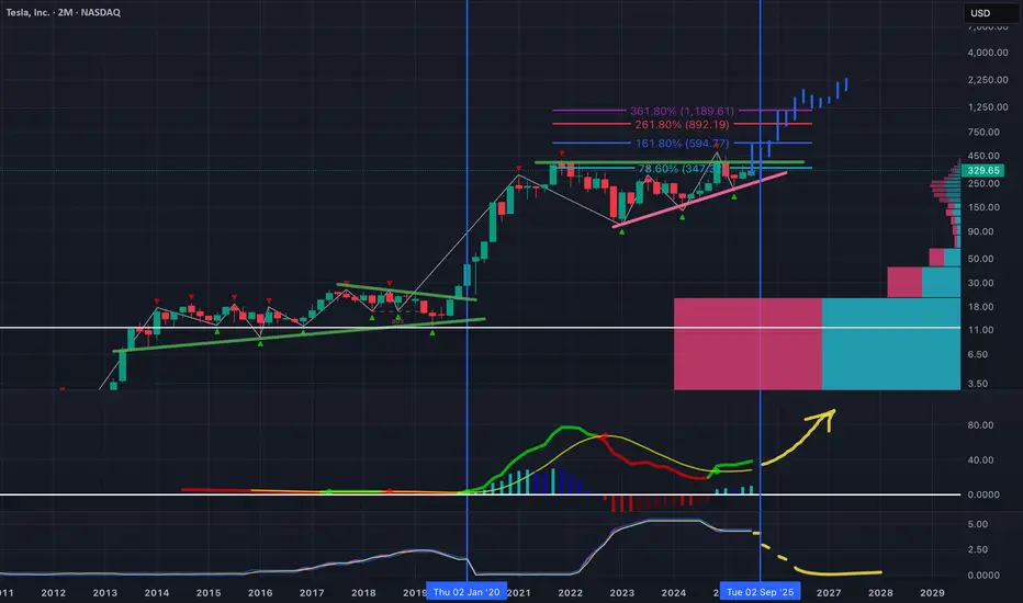Tesla’s long-term bullish structure remains intact on the 2-month logarithmic chart, with price breaking out of a two-year ascending triangle capped near $350. This move tests the 78.6% retracement level at $347, opening the door to Fibonacci extension targets at approximately $595, $892, and $1,189 if momentum follows through.