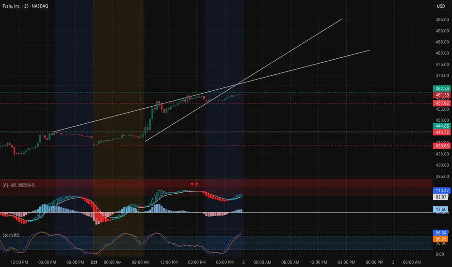 Tesla has pushed strongly into the $461–$462 zone, where sellers are starting to show up. On the 15-min chart, price is hugging the upper trendline of the short-term channel. Momentum is extended, but both MACD and Stoch RSI suggest buyers are still pressing their advantage.