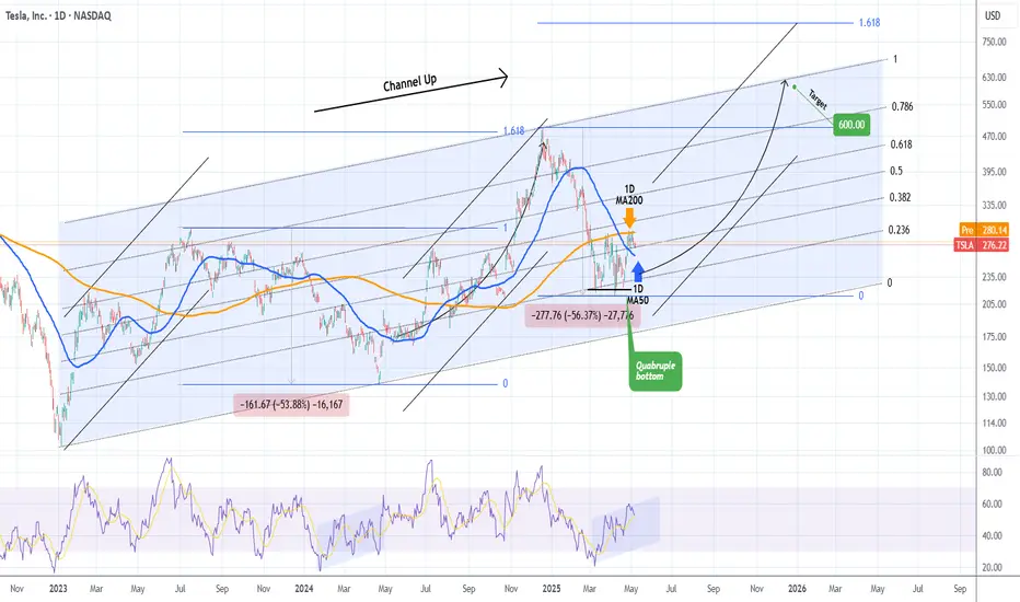 Tesla (TSLA) is seeing a steady recovery from the April 21 2025 Low, which has been a Quadruple Bottom, and has found itself consolidating the last 10 days within the 1D MA200 (orange trend-line) and the 1D MA50 (blue trend-line).
