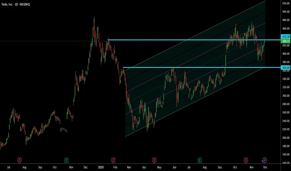 The price action of TSLA respects the upward channel, indicating that the stock is moving within defined boundaries. If TSLA breaks above the **430** resistance, the next target is **460**. However, a minor pullback might occur before the upward movement continues.