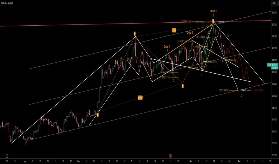 This chart highlights multiple harmonic and Elliott structures aligning for a potential bullish extension in Tesla (TSLA). A well-defined ABCD pattern and 3-Drive pattern suggest momentum building toward the $500 zone, supported by Fibonacci projections and channel resistance.