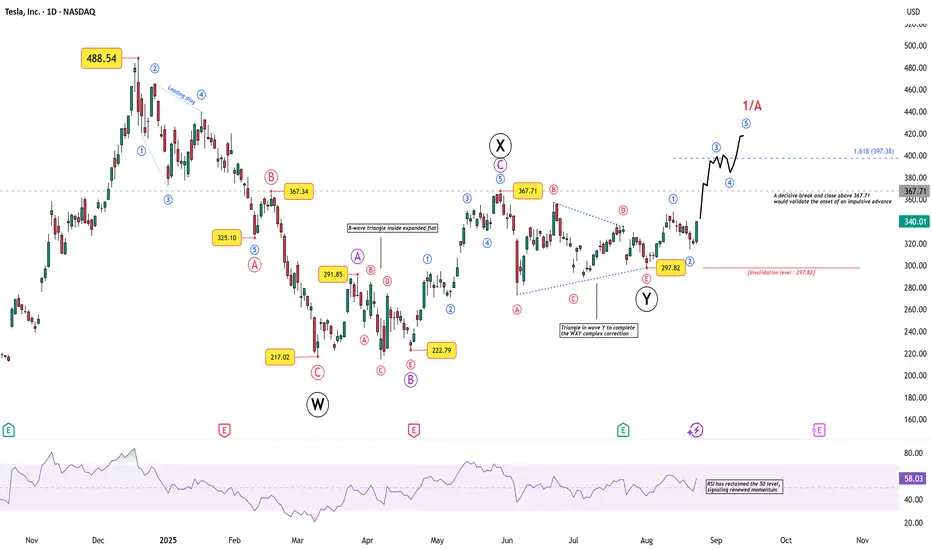 If the count holds, Tesla could be in the early stages of a larger impulsive rally, with Wave 1/A projecting toward the 400–420 zone. However, traders should remember that breaking below 297.82 invalidates the impulsive outlook and revives the broader corrective scenario.