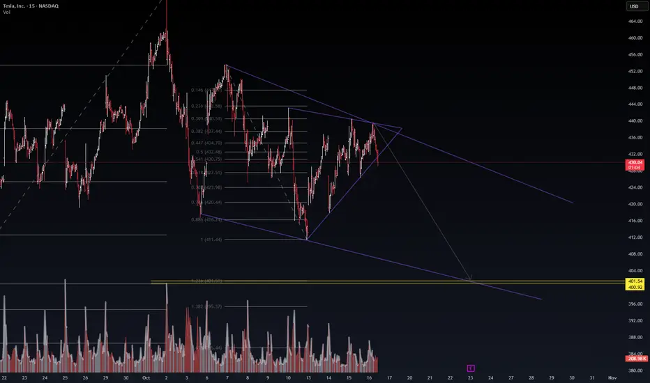 Fib confluence supports a leg toward $411–$401 zone (1.0–1.272 extension).