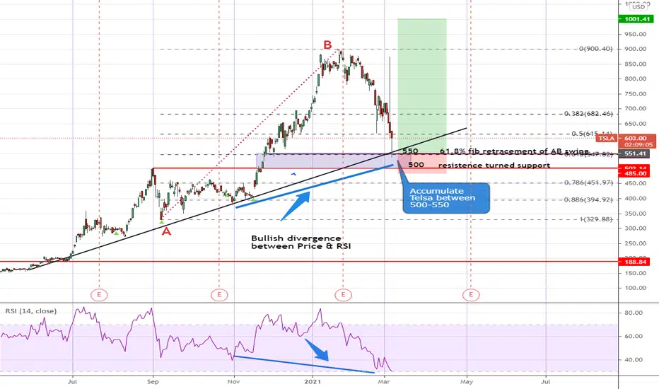 Telsa "crashed" into a support zone 500 - 550 today, hitting a low of 539 before recovering to possibly form a bullish pin bar today. This is a zone with a confluence of "supports", namely a trendline support, 61.8% fib retracement and also a "resistence turned support". Adding to these, there is a bullish divergence in the making.