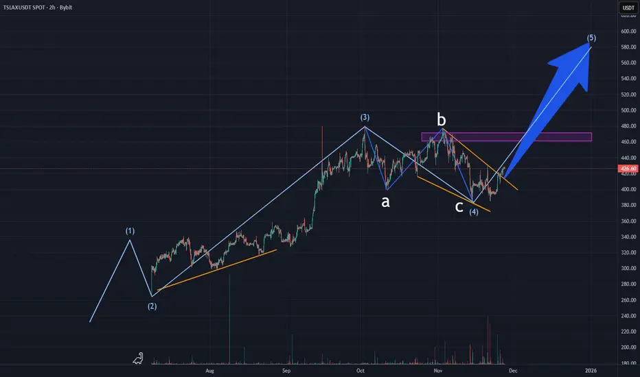 Tesla (TSLAX, TSLA) is forming its 5th full wave of growth according to Elliott Wave Theory.