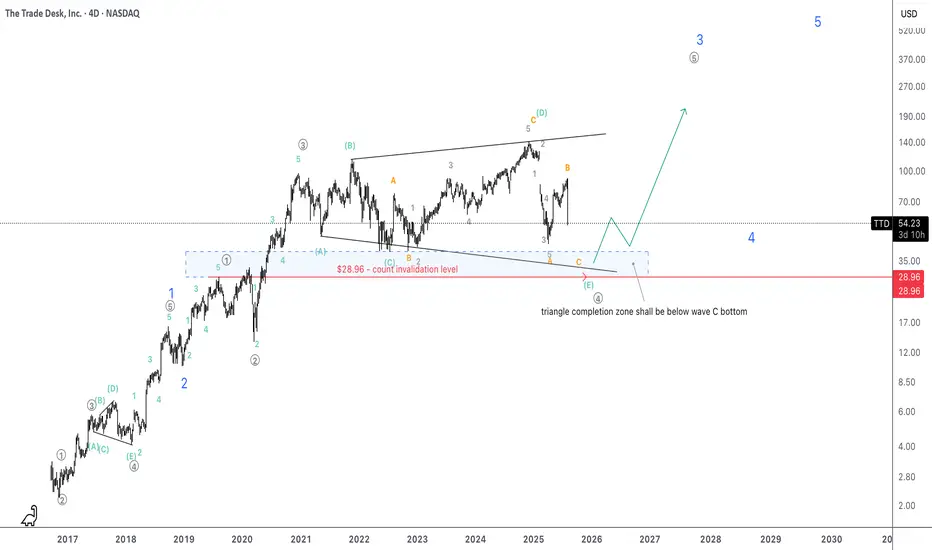 Short term, TTD, obviously goes further down to complete wave E and I will start buying in the blue area and in the mean tome will monitor 5 wave structure of C of E.