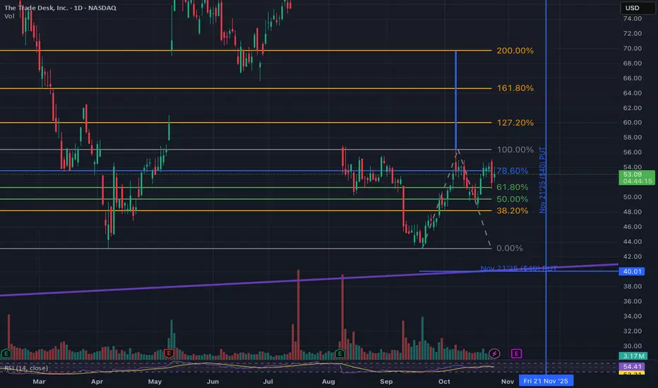 TTD has been forming a clear inverse head and shoulders pattern since its ER drop on 8th of August. If the pattern plays out TTD can reach around $70 where the 200% fib extension is.