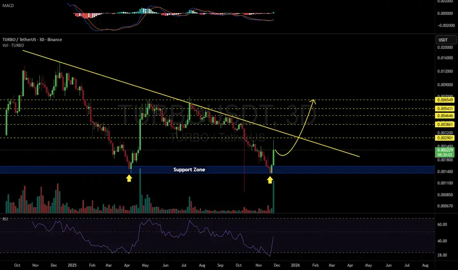 #TURBO has bounced off the support zone perfectly with significant volume on the 3-day timeframe. RSI is showing potential for upward movement. In case of a breakout above the descending resistance, the potential upside targets are:
