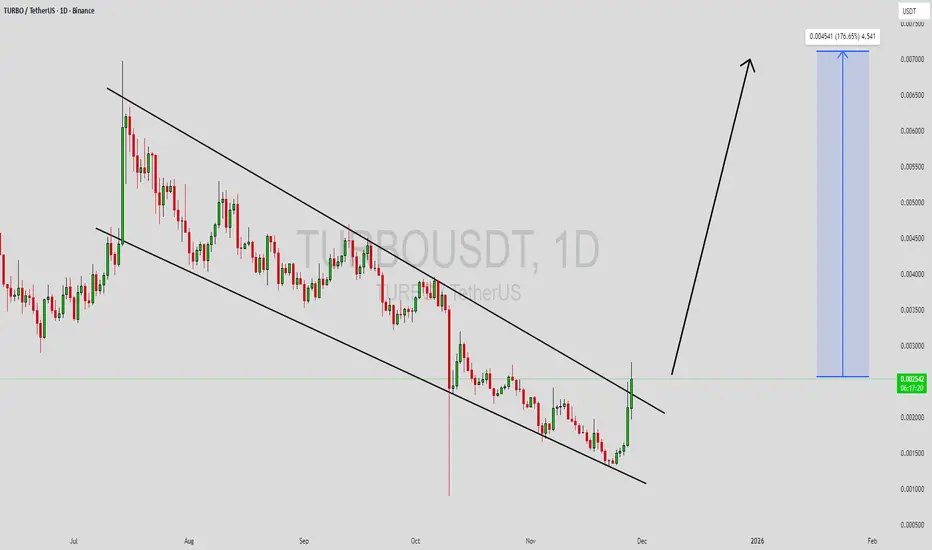 TURBOUSDT is forming a clear falling wedge pattern, a classic bullish reversal signal that often indicates an upcoming breakout. The price has been consolidating within a narrowing range, suggesting that selling pressure is weakening while buyers are beginning to regain control. With consistent volume confirming accumulation at lower levels, the setup hints at a potential bullish breakout soon. The projected move could lead to an impressive gain of around 140% to 150% once the price breaks above the wedge resistance.