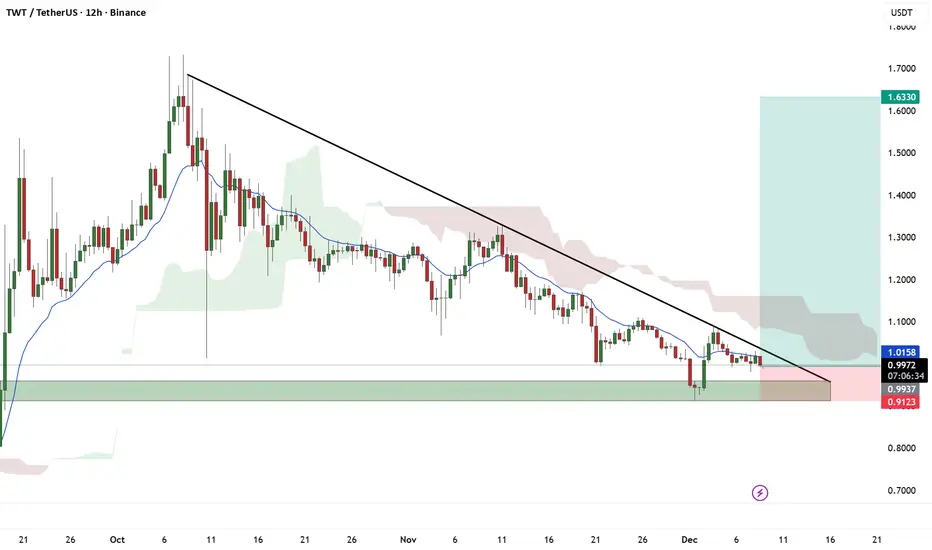 TWT/USDT on the 12-hour chart is still moving in a clear downtrend because price is trading below the descending trendline and also below the EMA, showing sellers are still controlling the market. Price is sitting inside a strong support demand zone around 0.95–1.00, and this zone has reacted before which means buyers are trying to defend it, but until the price breaks and closes above the trendline and 1.02–1.03 area with strength, upside continuation is not confirmed. If price keeps failing at the trendline it can stay weak and continue sideways or even push down toward the lower support area around 0.91, but if buyers manage to break out cleanly above resistance, then recovery toward higher levels becomes possible. Right now the structure is bearish but sitting on support where reaction can happen, so the next move depends on whether price breaks up from the trendline or gets rejected again.