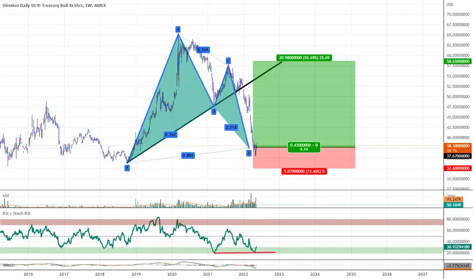 There is RSI Bullish Divergence at the PCZ of a Bullish Bat that's Visible on the Weekly Timeframe. This may also signal the beginning of a moderate pullback within the DXY as initially, I expect the DXY to show a Negative Correlation with Rising US BOND prices.