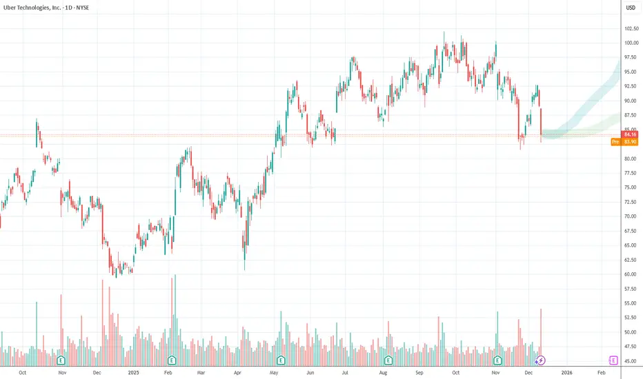 Uber offers a combination of low valuation, improving profitability, strong analyst conviction, and dominant competitive positioning. Current pricing reflects short-term regulatory and guidance noise rather than long-term fundamentals. The setup favors a long position targeting a re-rating toward consensus levels (~$110–$120) with optionality for further upside if margin expansion continues.