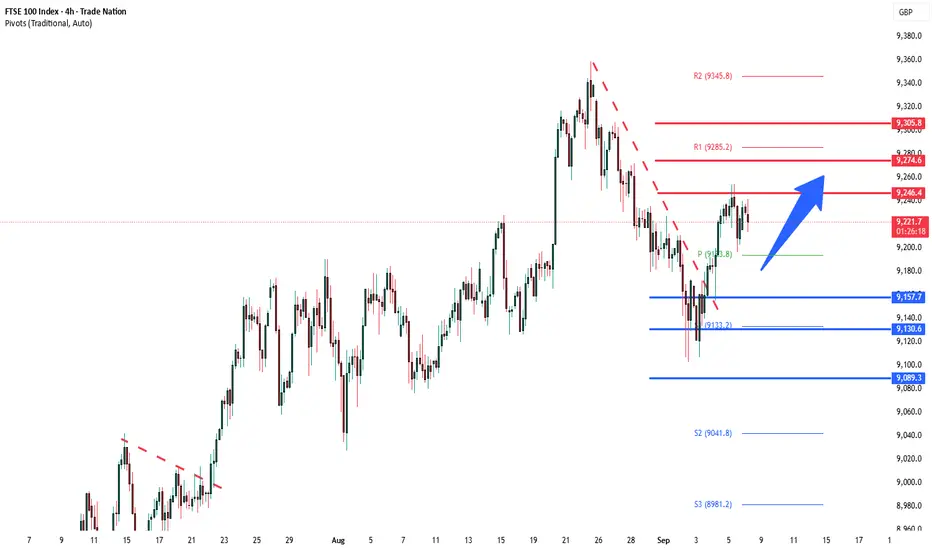 Bullish bias remains intact while the FTSE holds above 9160. A sustained break below this level could shift momentum to the downside in the short term.