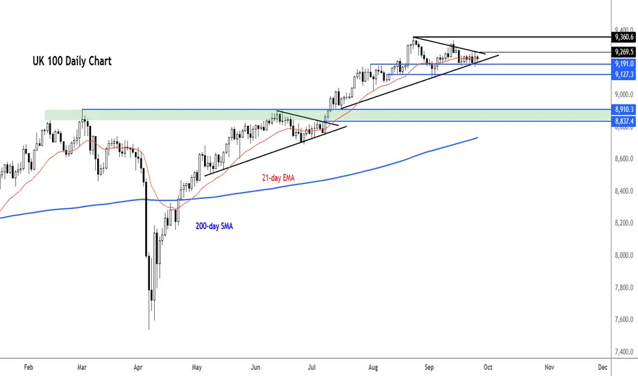 The FTSE remains in consolidation mode for now, but the underlying trend is still arguably bullish. The index was holding inside a consolidation pattern, coiling before a potentially large breakout. 9270 is the level to watch on the upside - a break above this could pave the way for fresh gains towards the all-time high of 9360. Support remains at 9190/1 area, lost that then the focus shifts to 9127.