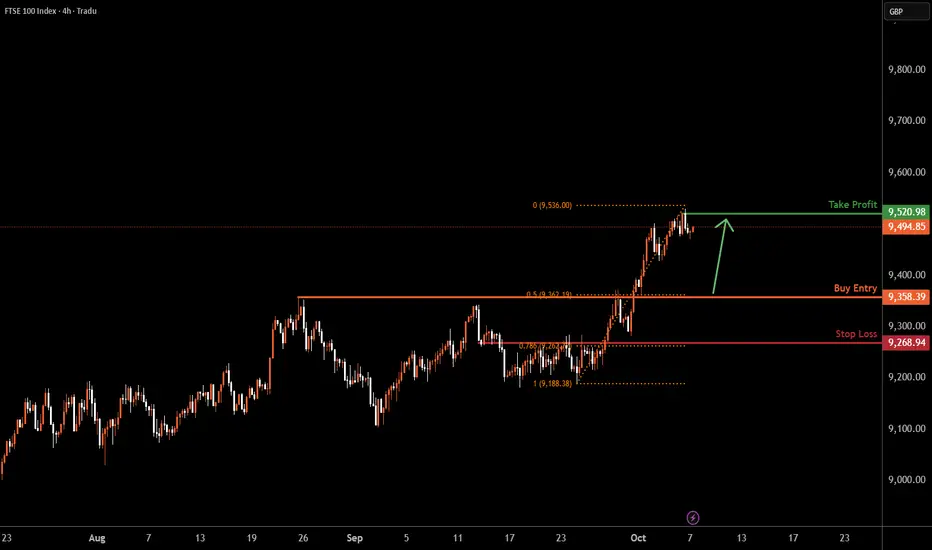 Based on the H4 chart analysis, we could see the price fall to the buy entry at 9,358.39, which is a pullback support that aligns with the 50% Fibonacci retracement and could bounce from this level to the upside.