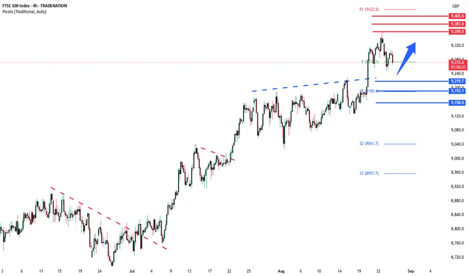 Bullish bias remains intact while the FTSE holds above 9220. A sustained break below this level could shift momentum to the downside in the short term.