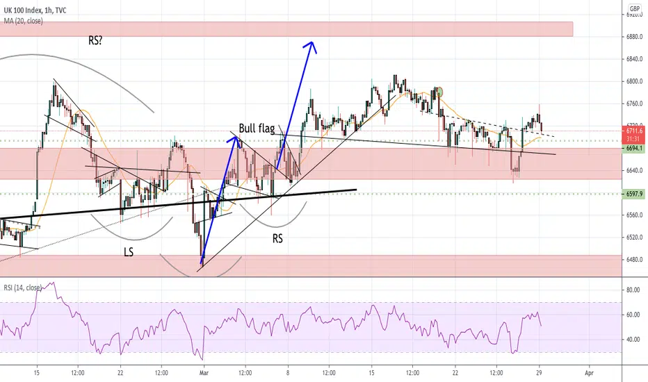 We are currently testing Friday's channel break. Good RR levels to go long for those who currently don't have a position. Nice gap at 6780 I would like to see filled, as well as the full target of the bull flag and inverse H&S of 6870. We have seen some month end selling during the previous few months which is something to keep an eye on and more reason to keep stops tighter. On the other hand, this month may be different given it is tax year end in the UK. Summary: Long with a tight stop