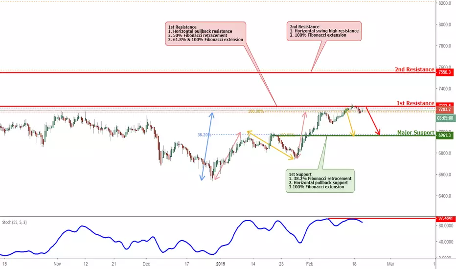 FTSE 100 approached our first resistance at 7233 (horizontal pullback resistance, 50% Fibonacci retracement , 61.8% & 100% Fibonacci extension ) where a strong drop might occur below this level pushing price down to our major support at 6961(38.2% Fibonacci retracement , Horizontal pullback support, 100% Fibonacci extension )